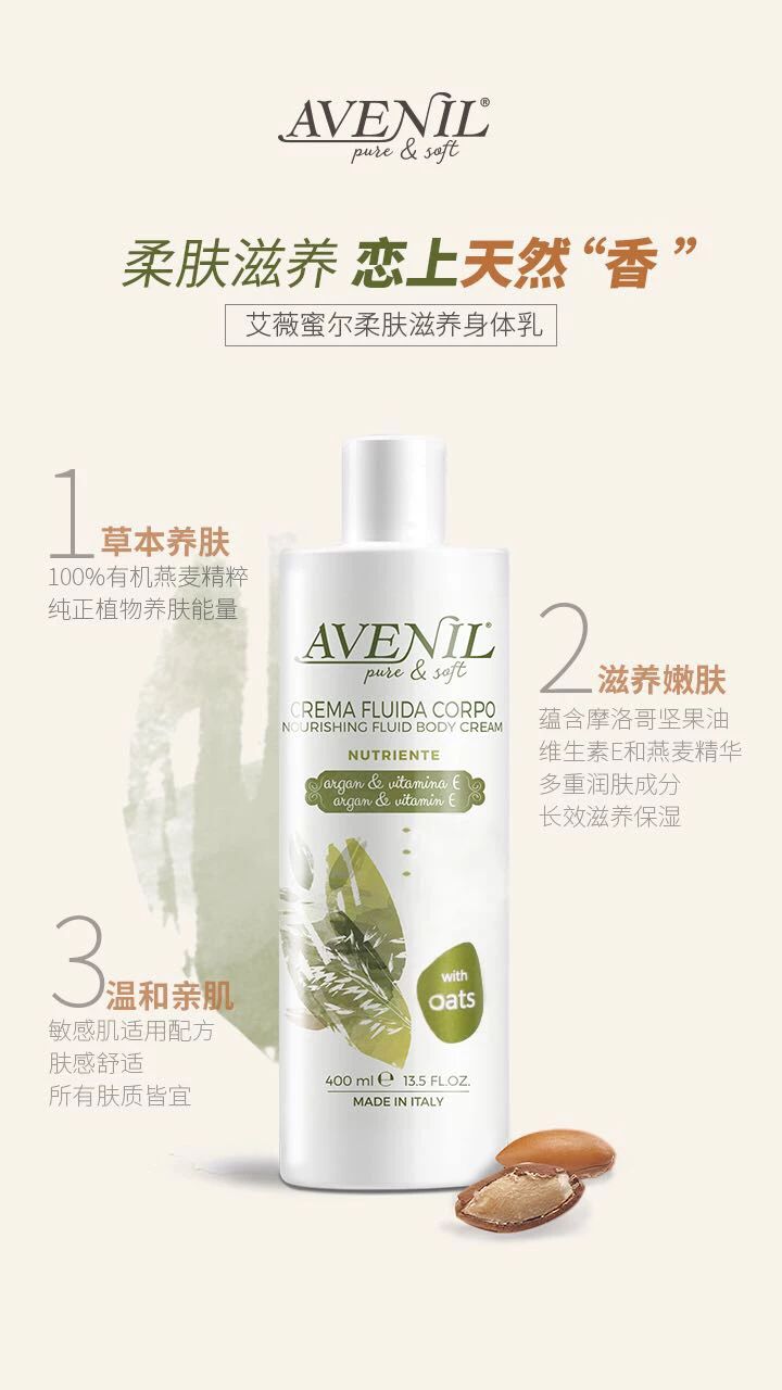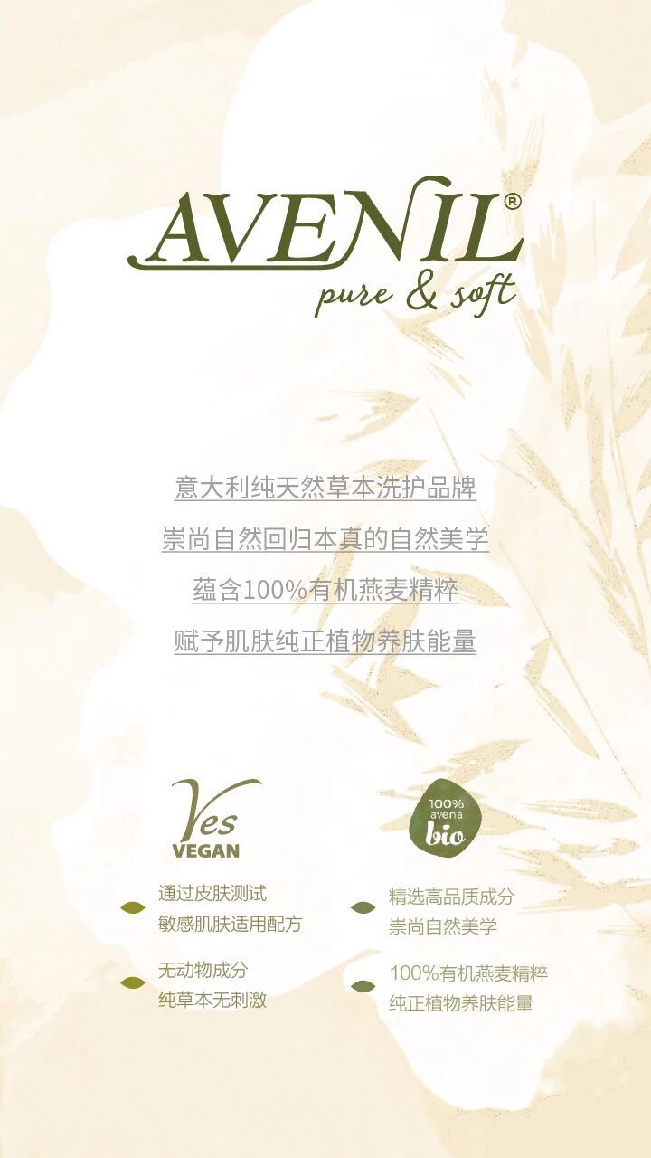 意大利纯天然草本洗护品牌-AVENIL艾薇蜜尔 时间:2019-12-26 来源:春源美业 浏览量: 意大利纯天然草本洗护品牌 牵手春源美业入驻中国市场 蕴含100%有机燕麦精粹 赋予肌肤纯正植物养肤能量 艾薇蜜尔植萃柔亮洗发露 艾薇蜜尔丝润嫩肤沐浴露 艾薇蜜尔柔肤滋养身体乳 三款洗护系列全新上市 自然美学 温润天成 上一篇:韩国医学护肤品牌-FOREVERSKIN恒久研肤 下一篇:春源 为您优选:“沙漠&死海”之美-emilia 伊密蕾娅 返回列表